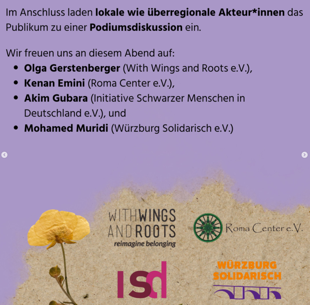 Eine Veranstaltung von Würzburg Solidarisch e.V., in Kooperation mit With Wings and Roots e.V., Roma Center e.V. und der Initiative Schwarzer Menschen in Deutschland e.V. im Rahmen der Internationalen Wochen gegen Rassismus.