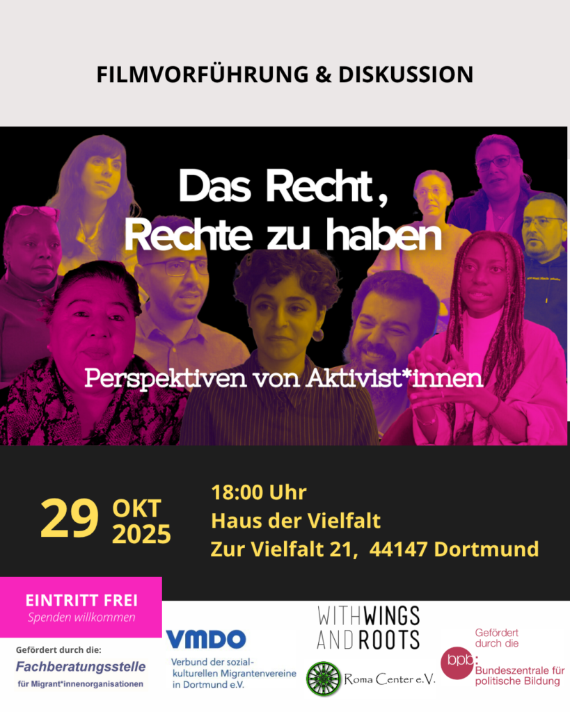 With Wings and Roots e.V. und der Verbund der sozial-kulturellen Migrantenvereine in Dortmund laden zu einer Vorführung des Kurzfilms «Das Recht, Rechte zu haben» mit anschließendem Podiumsgespräch ein. Ihr seid herzlich eingeladen, an der Vorführung teilzunehmen, eure Geschichten zu teilen … Lies mehr