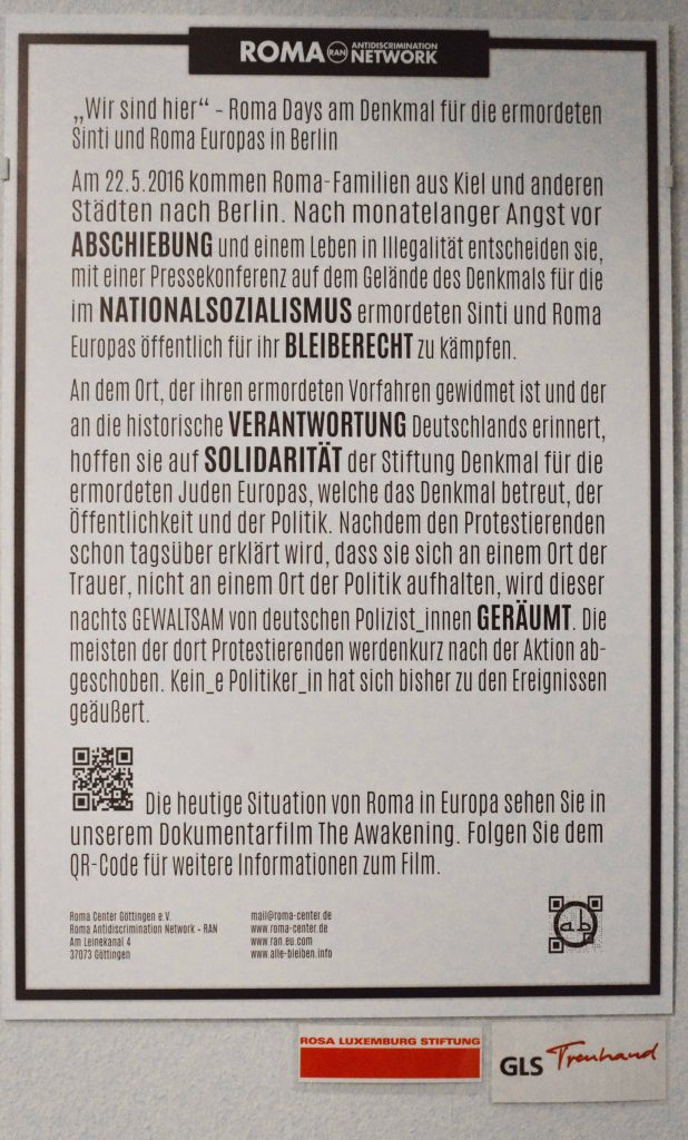Die anwesenden Gäste waren weiterhin sehr interessiert und diskutierten während und nach der Führung engagiert über strukturelle Diskriminierung von Roma, den Umgang mit Asylbewerber_innen, die historische Verantwortung Deutschlands für Roma, die Schwere der Lage insbesondere für Kinder sowie auch über potentielle Ansätze zu politischen Veränderungen durch die Kinderrechtskonvention oder eine Kontingentlösung für Roma. Kenan Emini verwies an dieser Stelle auf die online zur Verfügung stehende Petition des Bundes Roma Verbandes, die bisher nur wenige Unterstützer_innen gefunden habe und forderte zur Verbreitung dieser Information auf.