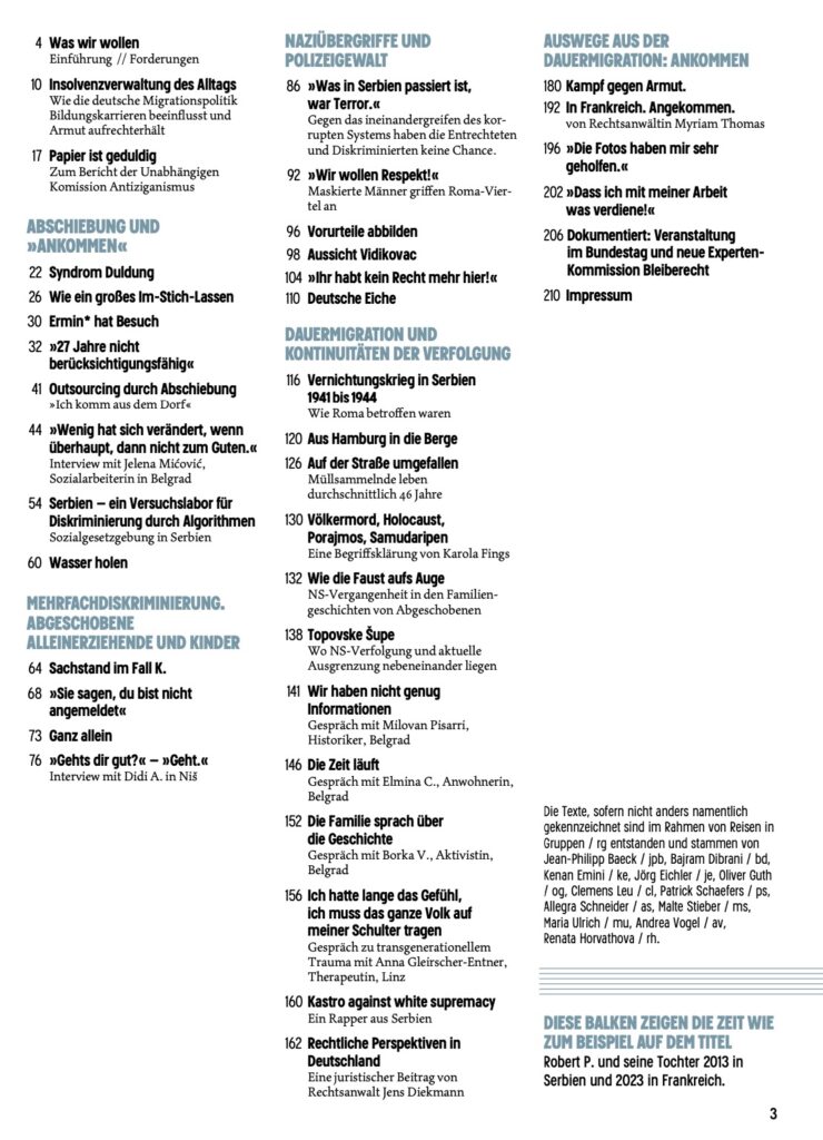 Sie sind Produkt eines interdisziplinären Recherche-Projektes von Anwält:innen, Journalist:innen und Ärzt:innen, Roma Center, Landesflüchtlingsräten, unterstützt durch Pro Asyl. In den letzten Jahren waren wir häufig vor Ort und jetzt berichten wir unter anderem aus Serbien, wo Roma sich gegen Angriffe wehren oder jahrelang um Papiere kämpfen müssen. Über zehn Jahre haben wir Menschen immer wieder getroffen.