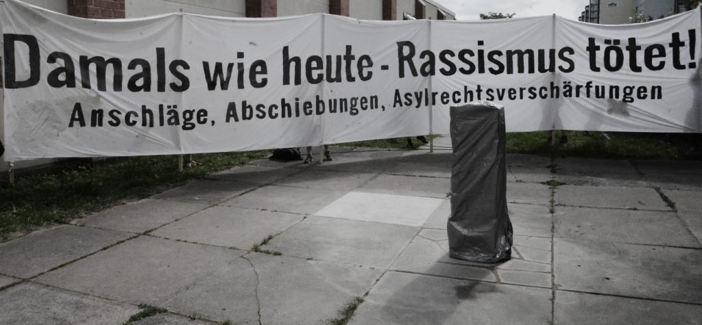 Eine Veranstaltungsreihe widmete sich dieses Jahr der rassistischen Gewalt gegen die Bewohner_innen des Sonnenblumenhauses in Rostock-Lichtenhagen vor 25 Jahren. In dem Haus befand sich die Zentrale Aufnahmestelle für Asylbewerber, vor der geflüchtete Roma wegen Überfüllung kampieren mussten sowie ein Wohnheim, in dem vietnamesische und kubanische Vertragsarbeiter_innen lebten. Zwischen dem 22. und dem 26. August 1992 hat ein rassistischer Mob das Sonnenblumenhaus und seine Bewohner_innen mit Wurfgeschossen, Feuerwerkskörpern und Brandsätzen angegriffen. Die gewalttätigen Ausschreitungen wurden von mehreren Tausend Schaulustigen bejubelt. Die Polizei blieb tatenlos.